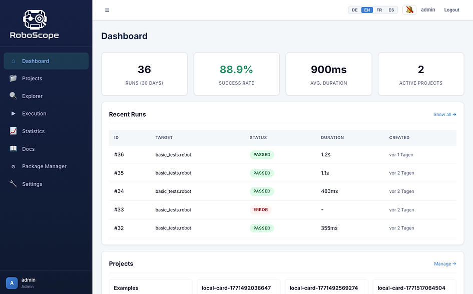 RoboScope schließt genau diese Lücke: Eine Web-Oberfläche, über die das gesamte Team — von Fachtester:innen bis Product Owner — Tests verwalten, ausführen und auswerten kann, ohne das Terminal zu öffnen.